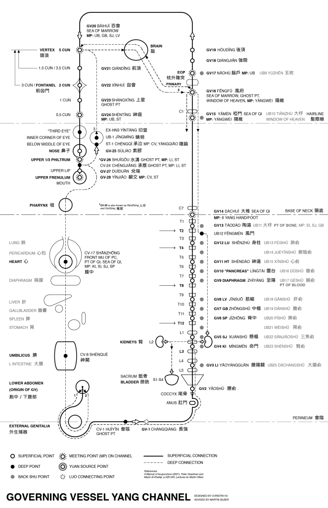 The Governing Vessel or Du Mai 督脈 is one of the Eight Extraordinary Meridians 奇經八脈 that run through the body according to Traditional Chinese Medicine (TCM). This is a visual diagram of the information presented in A Manual of Acupuncture (2001) by Mazin Al-Khafaji and Peter Deadman, as well as advice from Professor and licensed acupuncturist, Martin Silber.
